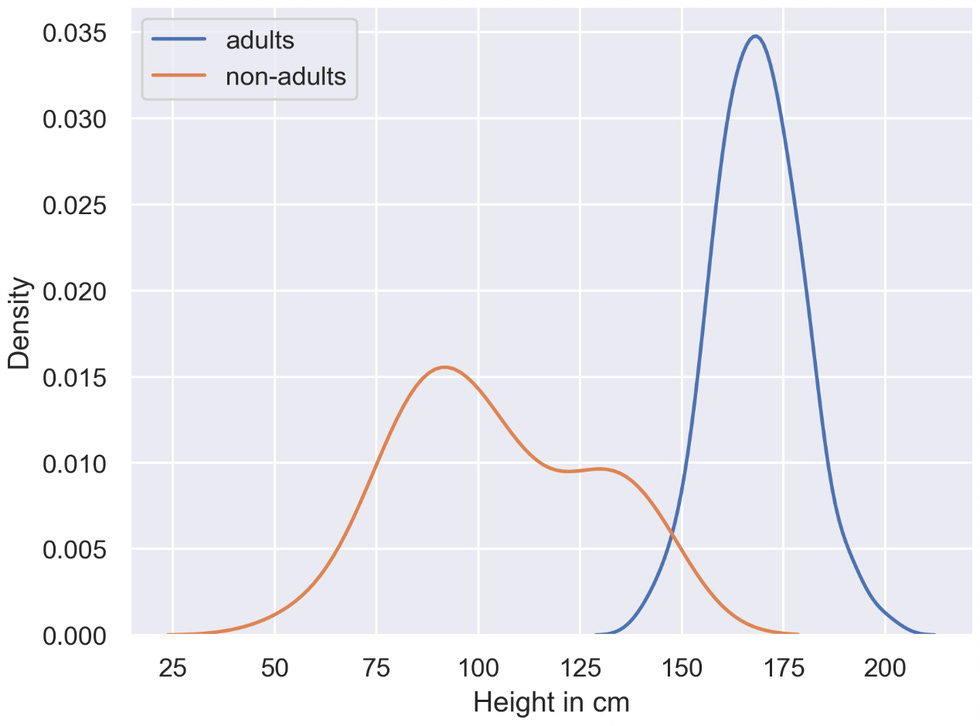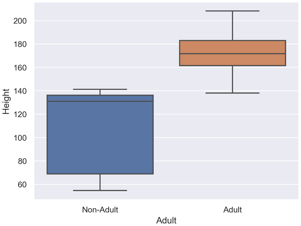 The following diagram shows a basic box plot for multiple variables. In this case, it shows heights for two different groups – adults and non-adults: