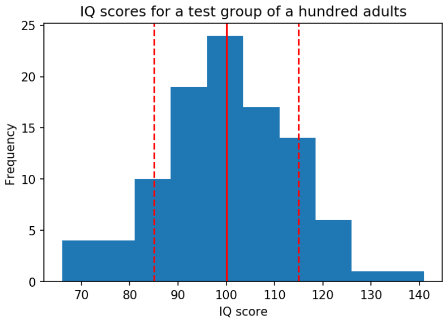 The above figure shows the distribution of IQ for a test group of hundred adults.
