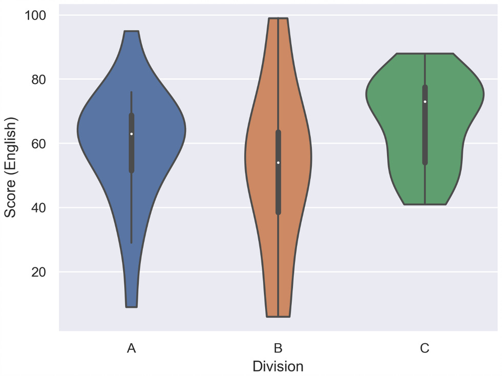 The following diagram shows a violin plot for a single variable divided into three groups, and shows the performance of three divisions of students in English based on their scores: